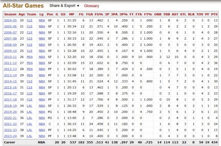 詹姆斯生涯首次入选全明星后缺席 此前出战20次得434分历史最多