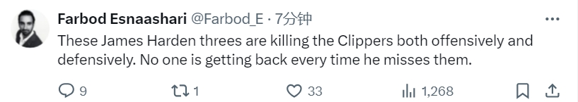 船记Farbod Esnaashari发推:“哈登这些三分球在攻防两端都在杀死快船,当他打铁的时候,每个人都退不回来。”