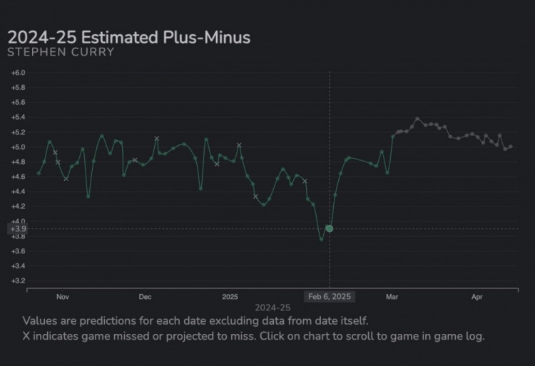 非常有趣的是,斯蒂芬的预计正负值在勇士队交易得到吉米之后就完全像火箭一样飞升了。