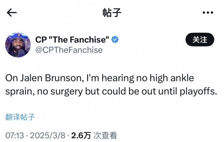 3月8日讯 今日,尼克斯自媒体博主CP“The Franchise”发推报道了尼克斯后卫布伦森的伤情。
