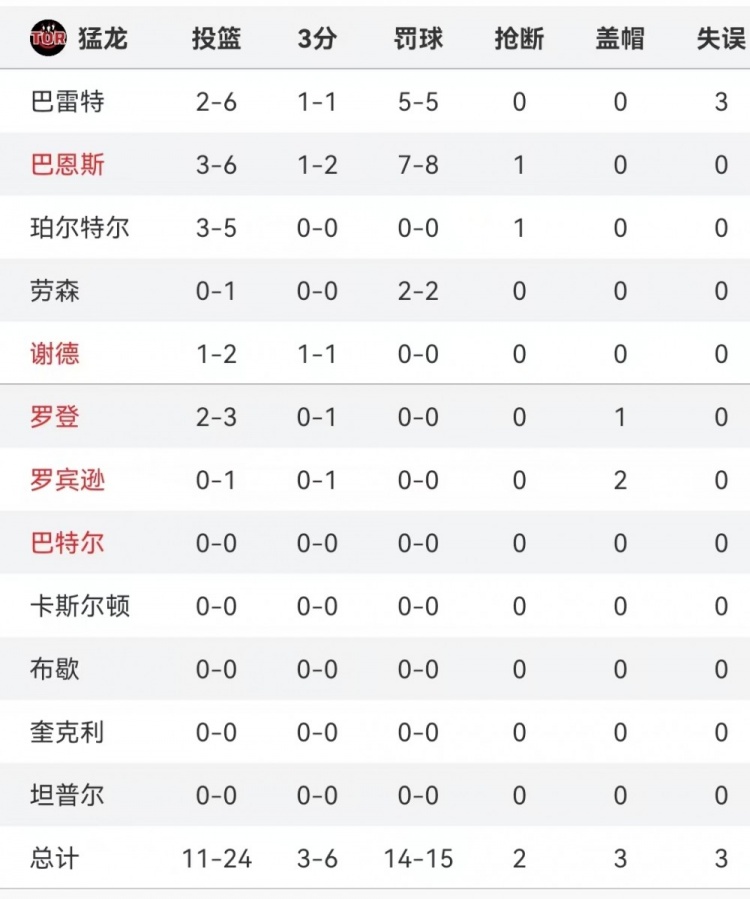 猛龙首节坚决冲击内线频频获得罚球,并且罚球命中率非常不错,全队15次罚球机会,罚进14球。其中巴恩斯8罚7中,巴雷特5罚5中。