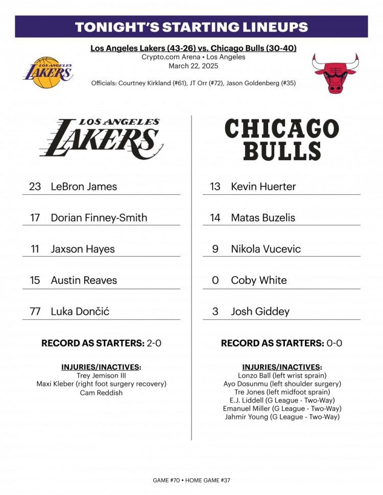 此役,詹姆斯与八村塁复出,东契奇、里夫斯、范德彪、电风扇、文森特等人均可出战。