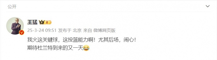 王猛在个人微博上写道:“我火这关键球,这投篮能力啊!尤其后场,闹心!