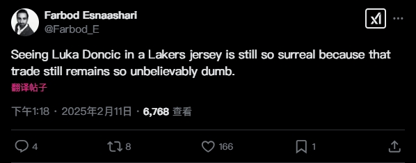 赛后,快船队记Farbod Esnaashari发推写道:“看到卢卡-东契奇身穿湖人球衣依然让人感觉很不真实,因为那笔交易是那么不可理喻!愚蠢。”