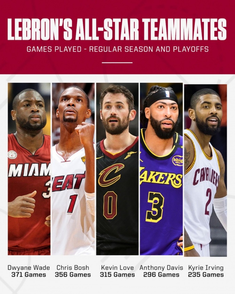 能联手东契奇打几场?詹姆斯生涯全明星队友:韦德/浓眉/欧文在列 联手詹姆斯出战场数前五球员 下方数字代表共同出战场数 2025/02/02