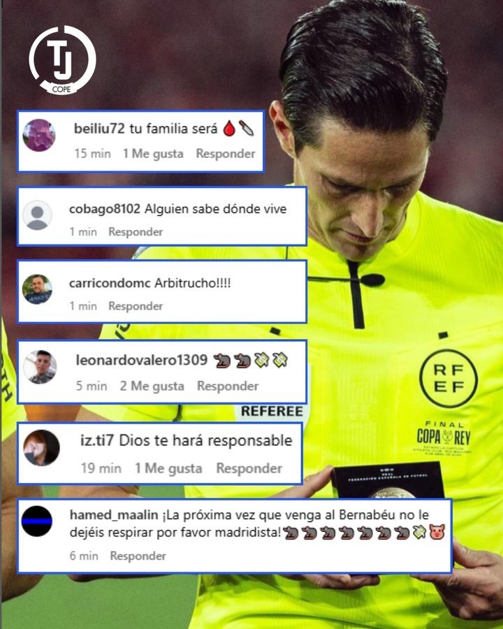其中不乏极其恶劣的死亡恐吓,包括“我要杀了你”、“你该担心孩子们的安危”、“街头遇见必让你拄拐”以及“下次来伯纳乌别想呼吸,皇马球迷们请堵死他”等言论。