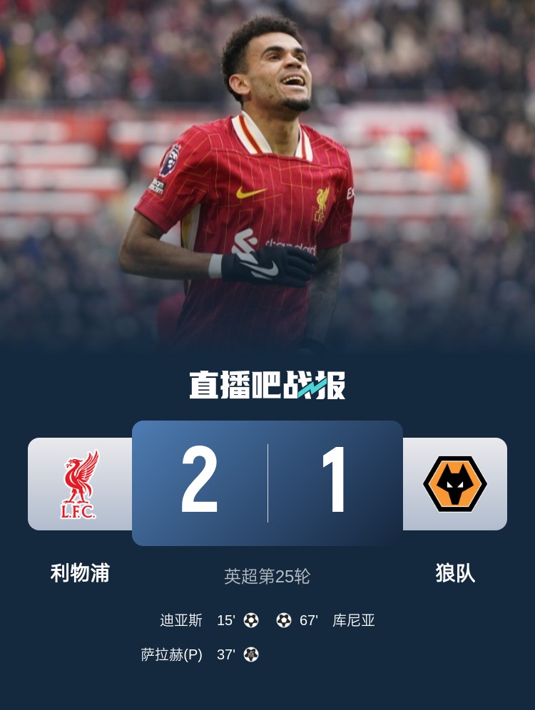 英超第25轮,利物浦2-1战胜狼队,迪亚斯破门、萨拉赫点射。
