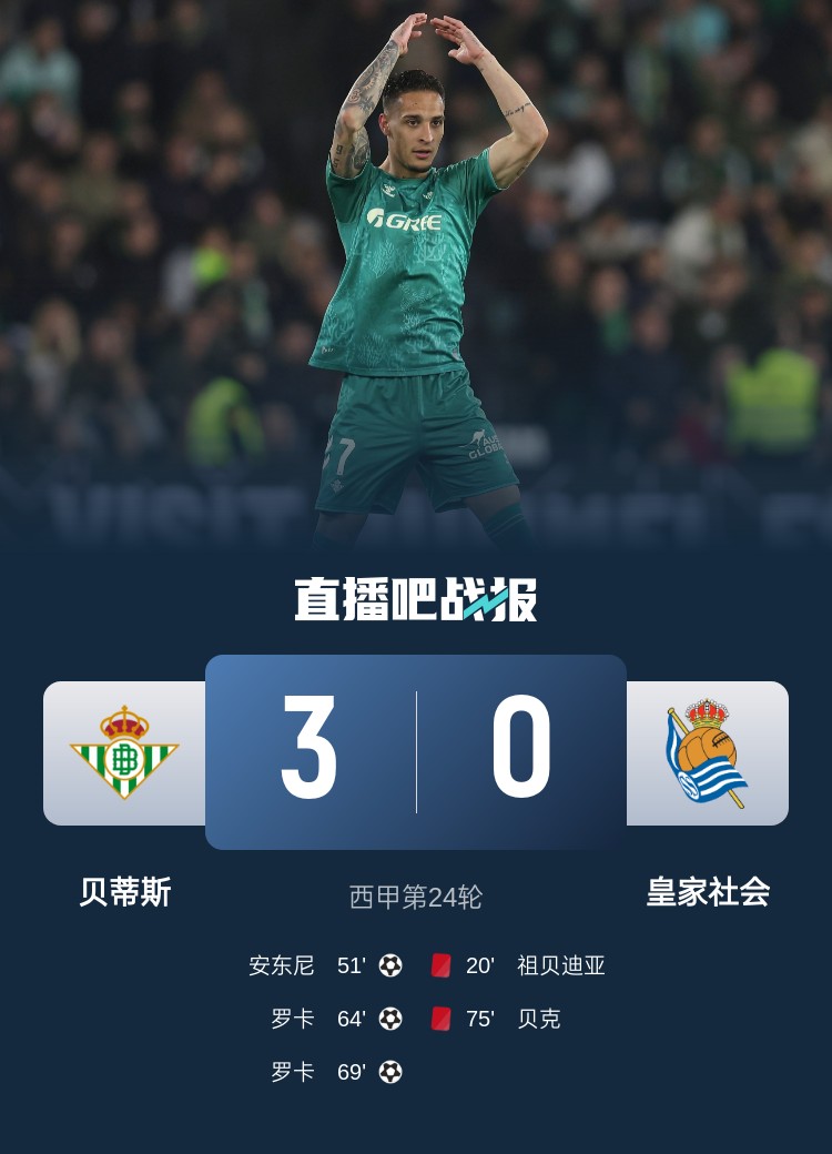 西甲第24轮,贝蒂斯3-0皇家社会,安东尼世界波,罗卡梅开二度。