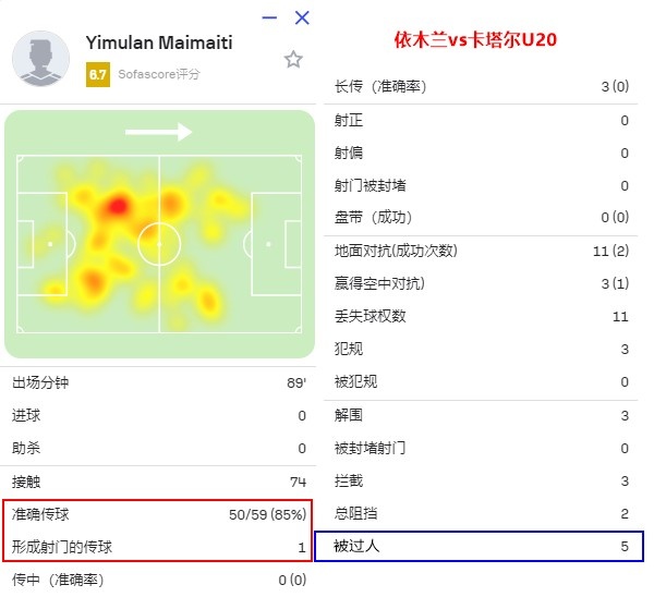 依木兰最被球迷津津乐道的一幕,就是发生在跟卡塔尔U20的比赛里。当时依木兰用一个布斯克茨式转身完成变向,随后送出直塞球给到队友陈泽仕,带来了随后的反击机会。