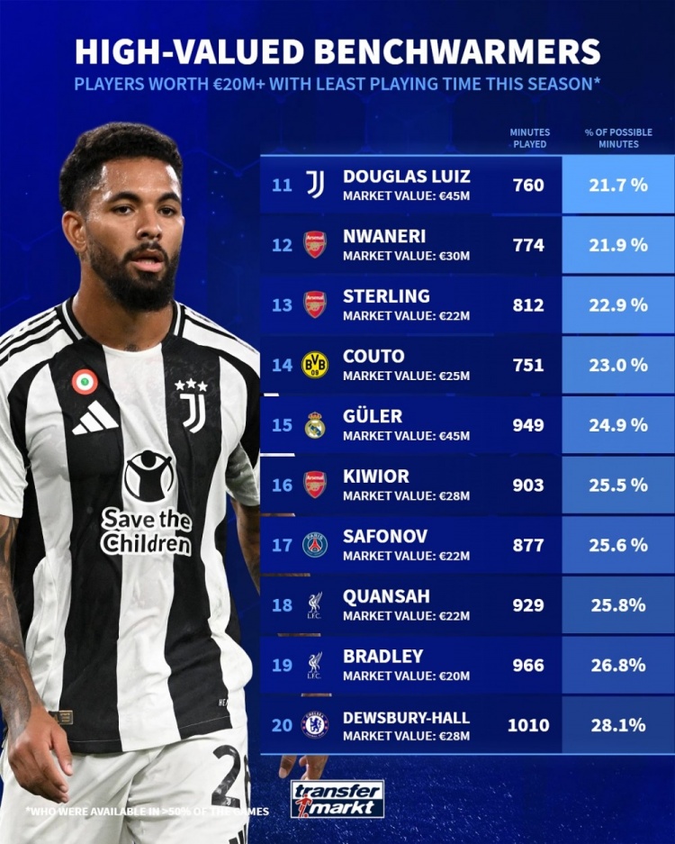 11、道格拉斯-路易斯,4500万欧元,尤文,出场760分钟,占总比赛时间21.7%