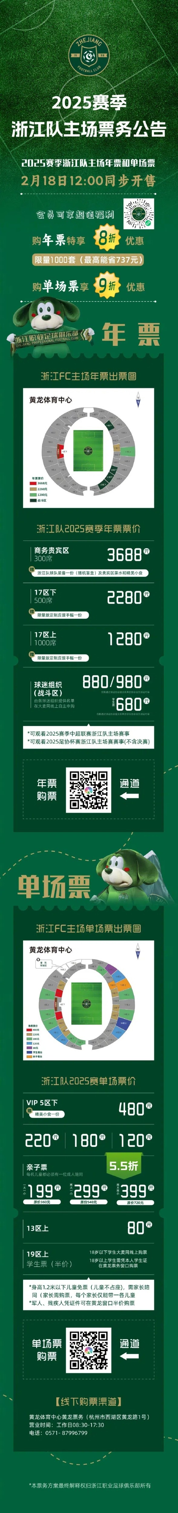 2月18日讯 浙江队官方公布了2025赛季主场年票和单场球票的票务方案,2月18日12:00将同步开售。