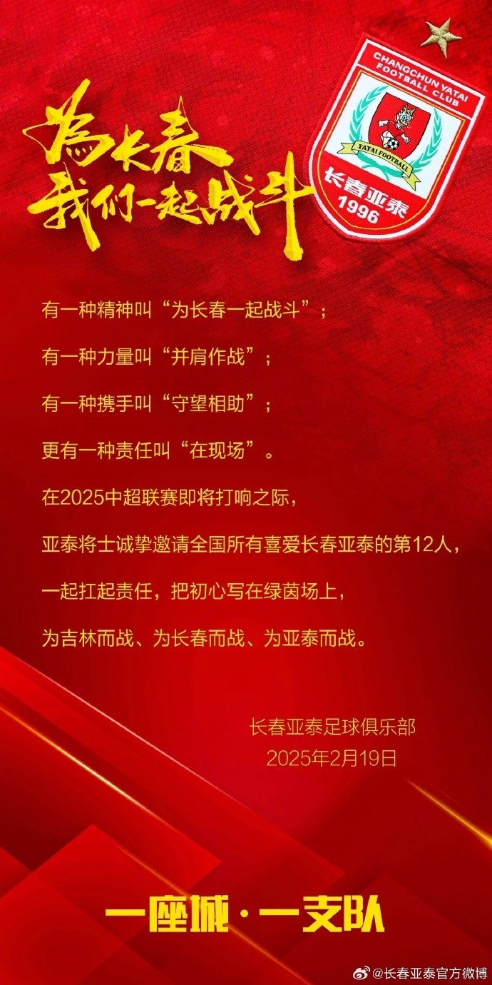 2月19日,正在上海备战的长春亚泰举行了以“为长春一起战斗”为主题的2025赛季华润饮料中超联赛出征仪式。俱乐部总经理曾皎峰受吉林省体育局、长春市体育局委托,向亚泰将士授旗,希望亚泰将士与第12人一起扛起责任,把初心写在绿茵场上,为吉林而战、为长春而战、为亚泰而战。“长春亚泰是中国职业足球俱乐部中为数不多的,有着悠久的历史传承的俱乐部。新赛季即将打响,我们团队中的每个人要满怀信心,时刻秉记责任、使命,为这个优秀的集体做出自己的贡献,赢得荣誉。”主教练谢晖说。