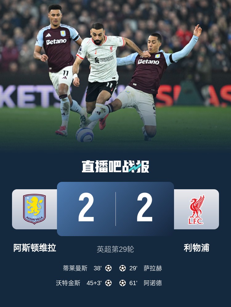 英超第29轮,利物浦2-2战平维拉。上半场,加西亚回传送礼,若塔抢断后助攻萨拉赫破门,蒂莱曼斯扳平,沃特金斯头球助维拉反超;下半场,萨拉赫助攻阿诺德进球,利物浦扳平比分,努涅斯屡次错失良机。