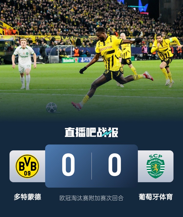 欧冠淘汰赛附加赛次回合,多特0-0葡萄牙体育,总比分3-0晋级16强。上半场,多特占据场上主动多次威胁球门,可惜未能把握住进球机会;下半场,阿德耶米造点,吉拉西主罚点球被扑,雷纳单刀中柱,埃姆雷-詹进球被吹。