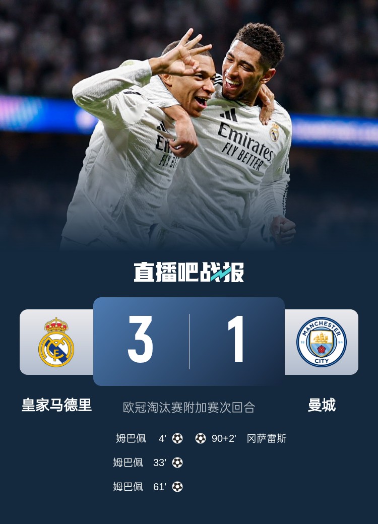 姆巴佩戴帽!皇马3-1曼城总比分6-3晋级16强 下轮战马竞或药厂