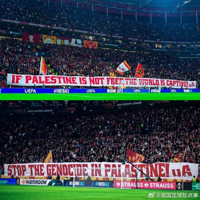 加拉塔萨雷球迷拉横幅:感谢凯尔特人球迷对巴勒斯坦的坚定支持