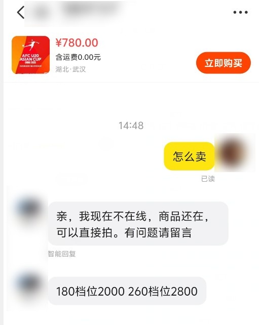 本场比赛门票开票后,1分钟就售罄,销售异常火爆!目前,有黄牛已经将原价180元的门票炒至1000-2000元,其他价位的门票价格更高。