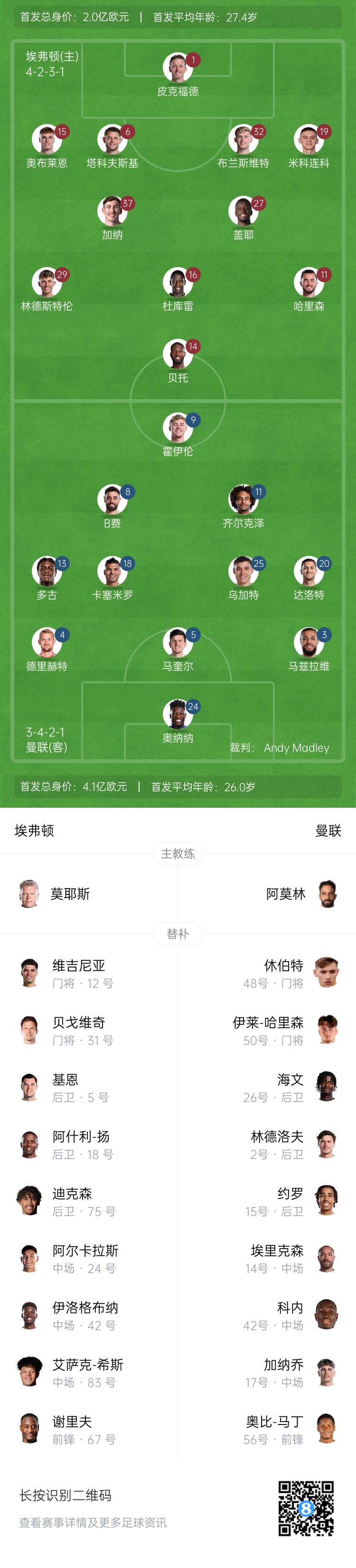 埃弗顿首发:1-皮克福德、15-奥布莱恩、6-塔科夫斯基、32-布兰斯维特、19-米科连科、27-盖耶、37-詹姆斯-加纳、16-杜库雷、29-林德斯特伦、11-杰克-哈里森、14-贝托