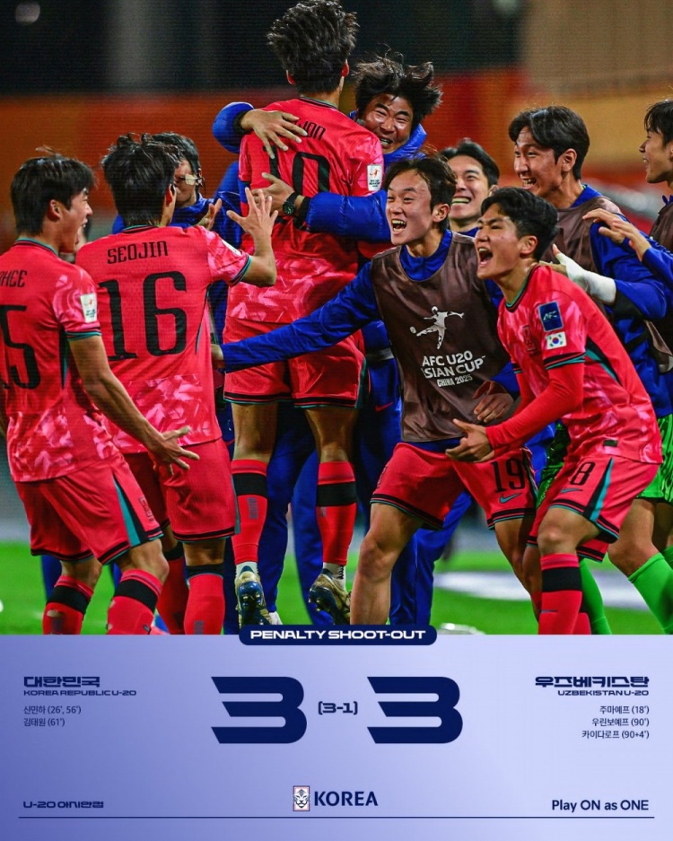 2月24日讯 U20亚洲杯1/4决赛,韩国U20和乌兹别克斯坦U20在常规时间战成3-3,最终通过点球大战韩国U20总比分6-4淘汰乌兹别克斯坦U20,获得世青赛资格。