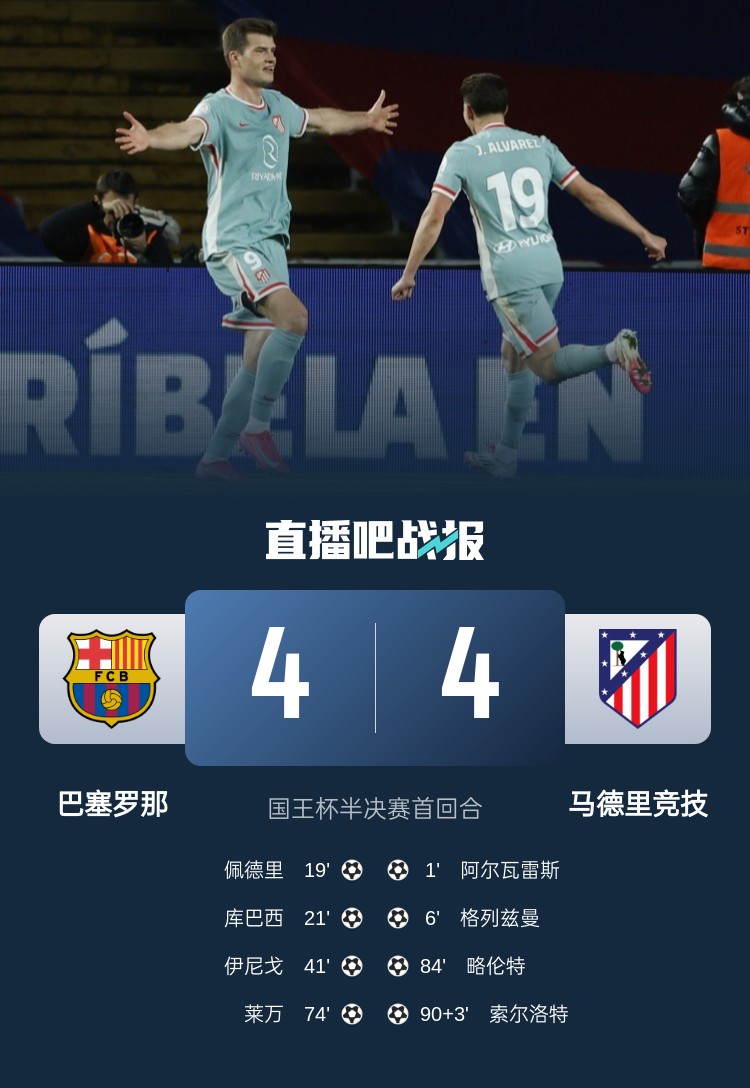国王杯半决赛首回合,巴萨4-4遭马竞绝平,本场双方上演进球大战!