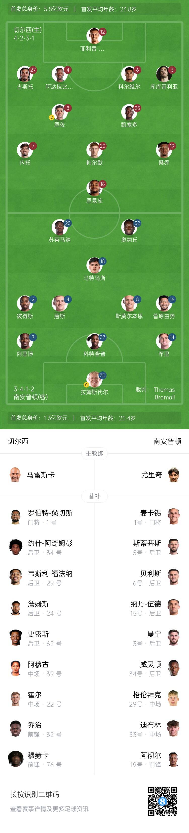 切尔西首发:12-约根森、27-古斯托、4-阿达拉比奥尤、6-科尔维尔、3-库库雷利亚、25-凯塞多、8-恩佐、7-内托、20-帕尔默、19-桑乔、18-恩昆库