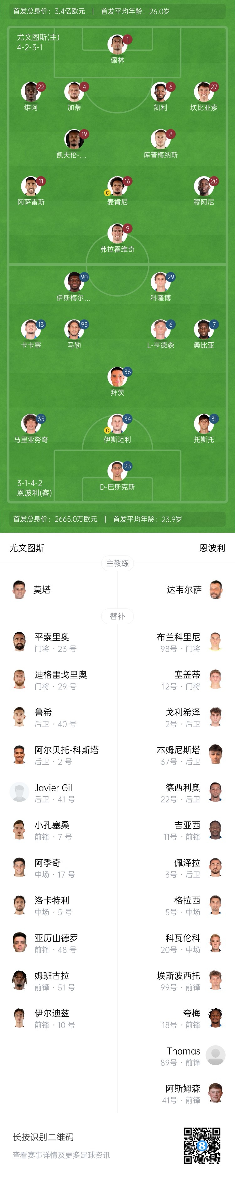 尤文首发:1-佩林、22-蒂莫西-维阿、4-加蒂、6-凯利、27-坎比亚索、19-K-图拉姆、8-库普梅纳斯、20-穆阿尼、16-麦肯尼、11-尼古拉斯-冈萨雷斯、9-弗拉霍维奇