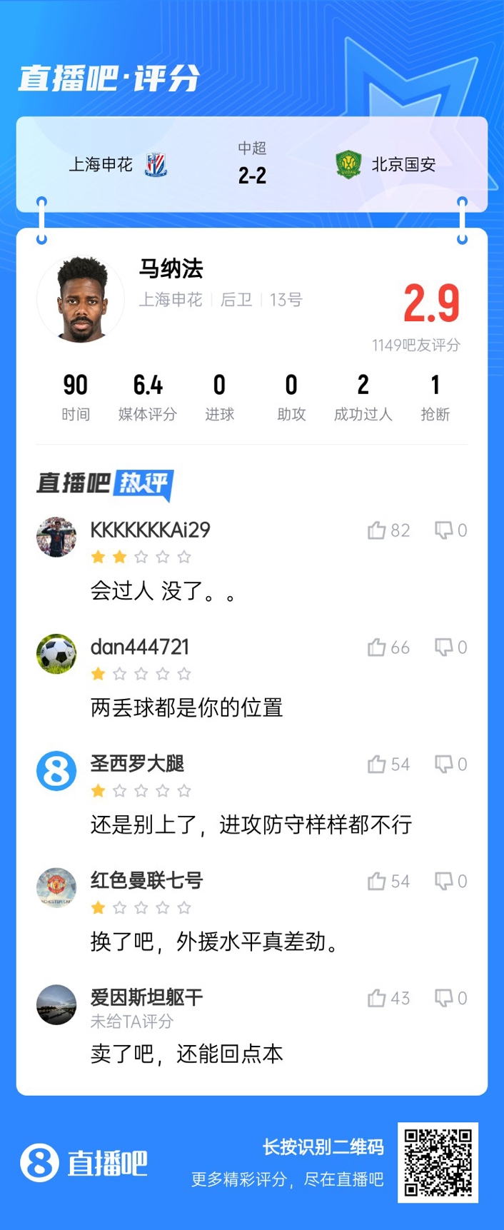 昨晚的京沪德比中,申花右后卫马纳法与两粒丢球都有关系。补时阶段没能防住李磊,后者强行起球助攻阿布雷乌完成绝平。