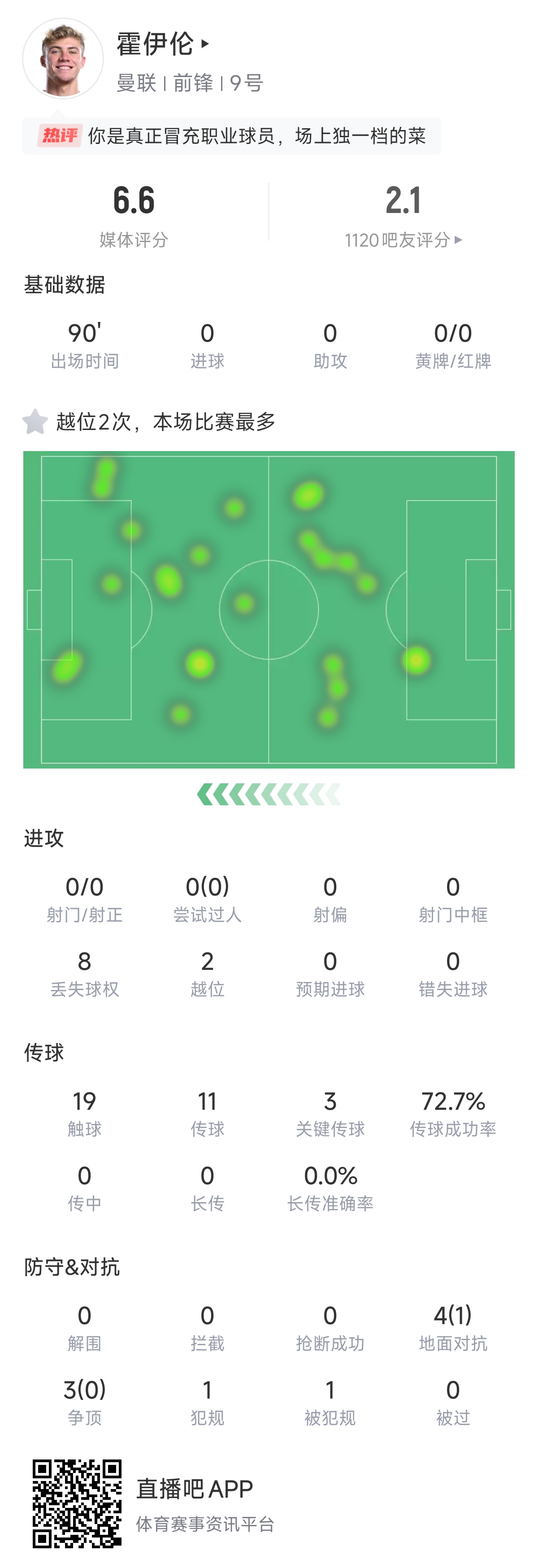 6000万身价怕是要掉了…22岁霍伊伦热点图遍布全场但0射0正2越位