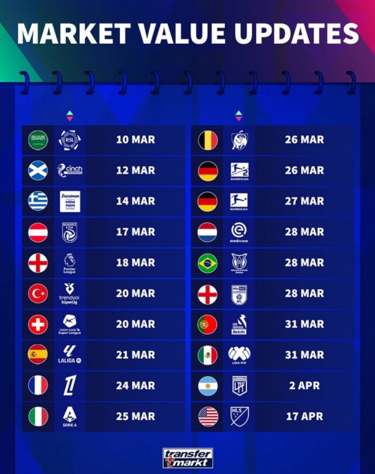 3月9日讯 德转公布3-4月各联赛球员身价更新时间,具体情况如下: