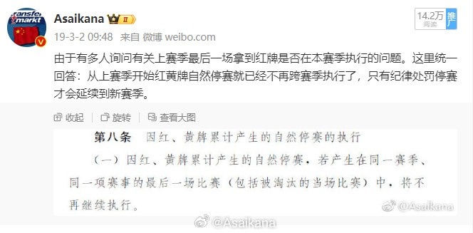 而亚足联则相反,红牌自然停赛需要跨赛季执行。现中足联和中国足协已经分家,中足联目前还是和中国足协保持一致,如果中足联日后出台与之不同的新的停赛执行细则,职业联赛范畴内当然也是要以中足联的规定为准。
