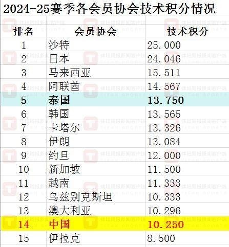 亚足联在2月底即亚冠精英联赛1/8决赛展开前,公布了亚足联本赛季中期下属各会员协会的技术积分排名,记者也曾撰文专门介绍过,中超联赛以53.837分排名亚洲第七、东亚第三;泰国联赛则以53.069分排名亚洲第八、东亚第四。就是说,截至前半赛季,中超仅仅领先泰超0.768分。
