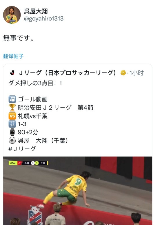 好在经过一番检查,吴屋大翔并无大碍,并回到球场继续比赛,比赛结束后,吴屋大翔也转发了自己“出糗”视频,并写道“平安无事。”,再次让球迷们安心。