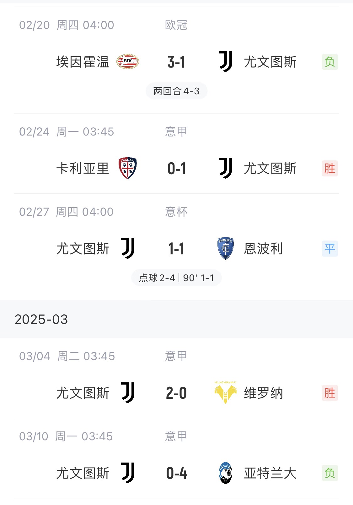 然而近一个月,尤文相继遭遇欧冠附加赛失利,意杯出局:欧冠附加赛两回合3-4不敌埃因霍温,无缘淘汰赛;意大利杯则是点球出局,不敌降级区的恩波利。