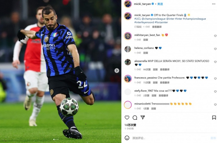 本场表现出色的姆希塔良晒出自己的比赛照,并表示:“晋级八强战!”