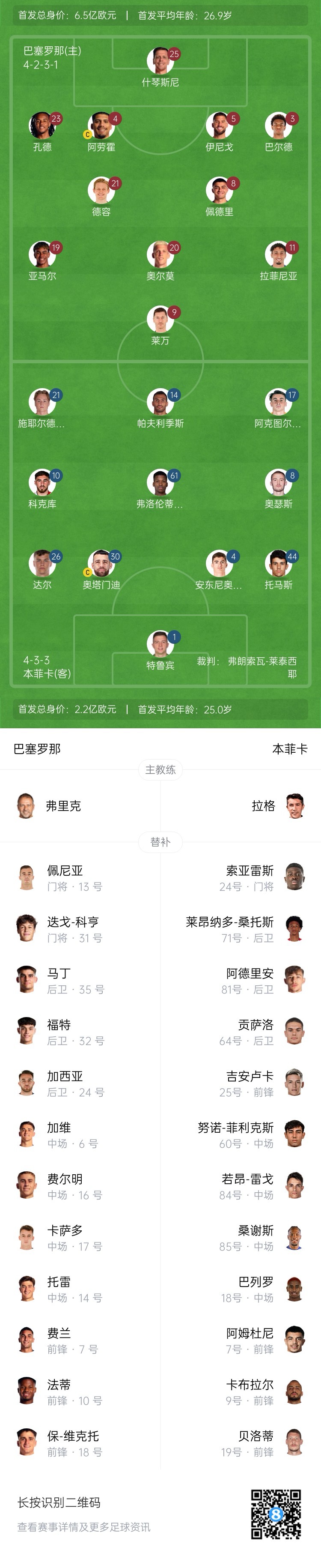 巴萨替补:13-佩尼亚、31-科亨、6-加维、7-费兰-托雷斯、10-法蒂、14-托雷、16-费尔明、17-卡萨多、18-保-维克托、24-埃里克-加西亚、32-福特、35-杰拉德-马丁