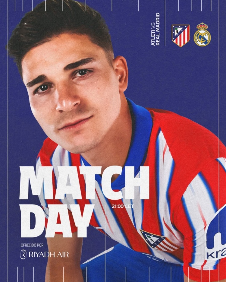 马竞方面也发布海报,上一场两队交手时取得进球的阿尔瓦雷斯单人出镜,右上角为对阵双方队徽。