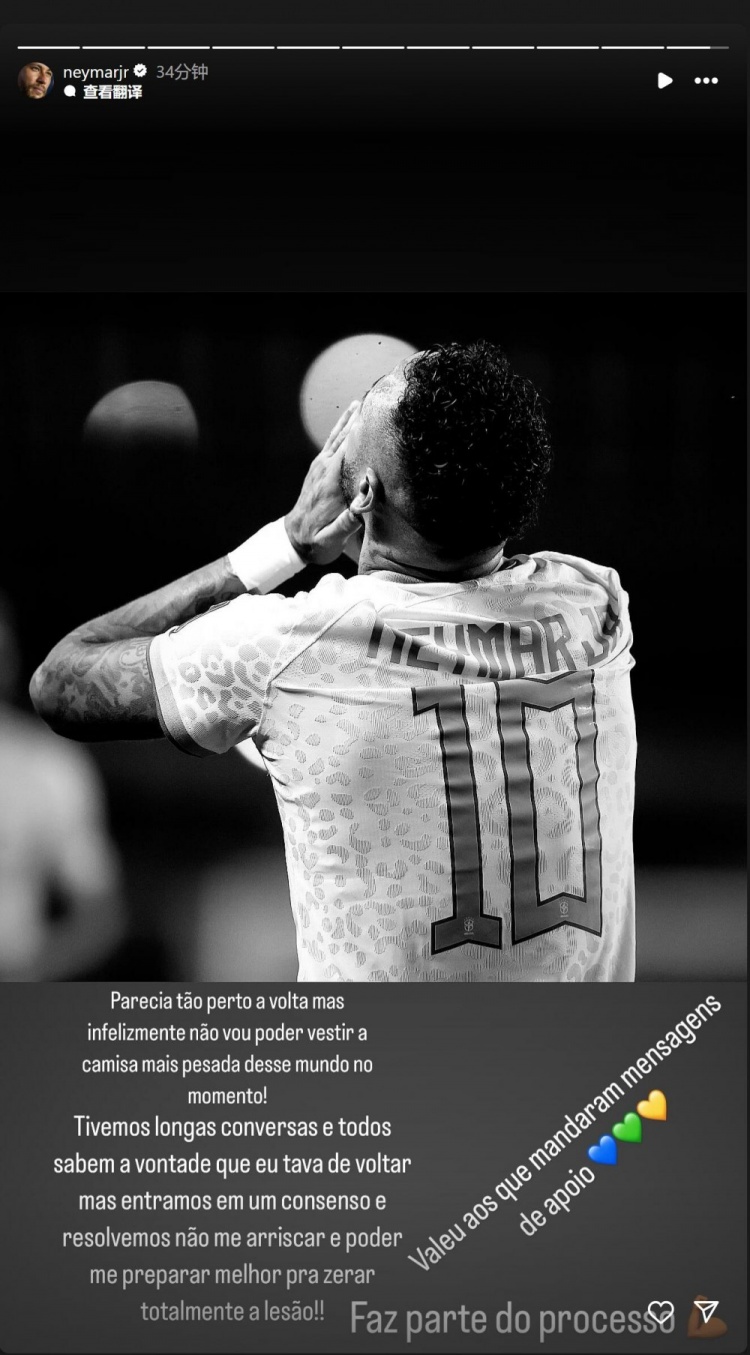 内马尔写道:“看似回归近在咫尺,但遗憾的是,目前我还无法穿上这件世界上最具分量的球衣!我们进行了长时间的交谈,大家都知道我渴望回归的心情,但我们(在沟通后)达成了共识,决定不冒险,而是更好地做好准备,等伤病完全痊愈!这是整个过程的一部分❤✈️”
