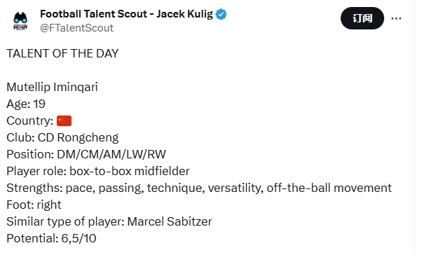 03月19日讯 王钰栋昨日登上全球球探网站Football Talent Scout“今日天才”板块,据博主“朗尼克”介绍,这是过去十年间第二个登上这个网站的中国球员。比王钰栋更早登上Football Talent Scout的是蓉城青训出身的木塔力甫。