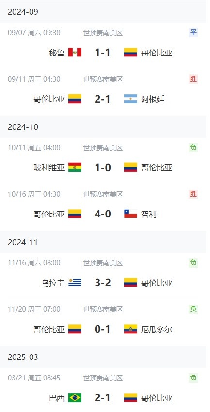 哥伦比亚在世预赛已经遭遇3连败,而在其美洲杯决赛不敌阿根廷之后,球队在近7场比赛只取得2胜1平4负。具体战绩如下: