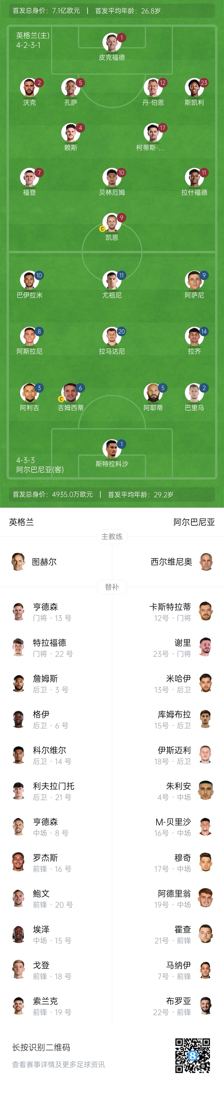 英格兰首发:1-皮克福德、2-沃克、5-孔萨、12-丹-伯恩、23-斯凯利、4-赖斯、17-柯蒂斯-琼斯、7-福登、10-贝林厄姆、11-拉什福德、9-凯恩