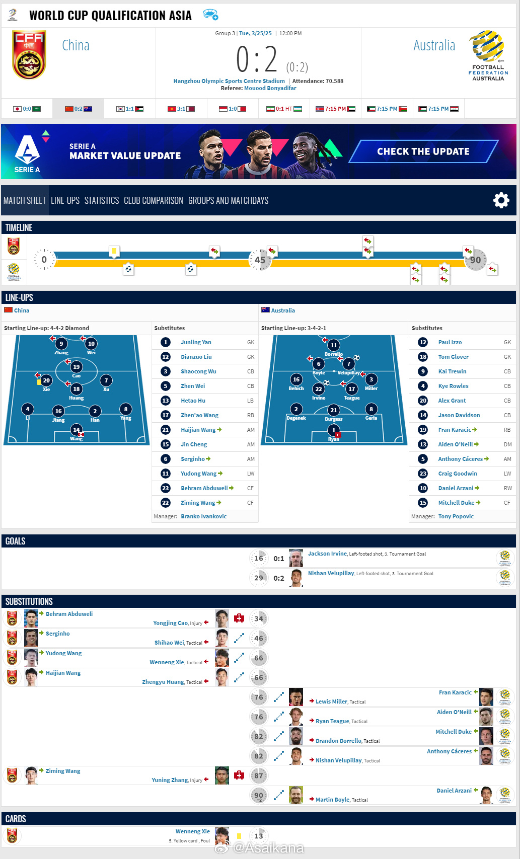 2026年世界杯亚洲区预选赛,中国0-2澳大利亚比赛报告 ​​​