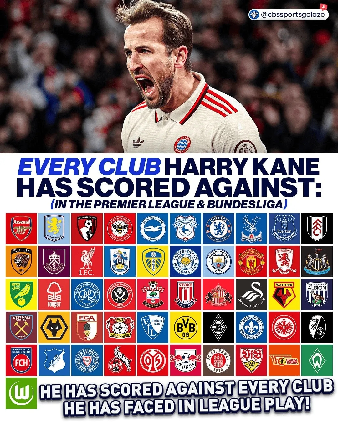 通杀,凯恩德甲、英超对阵51家俱乐部均完成破门