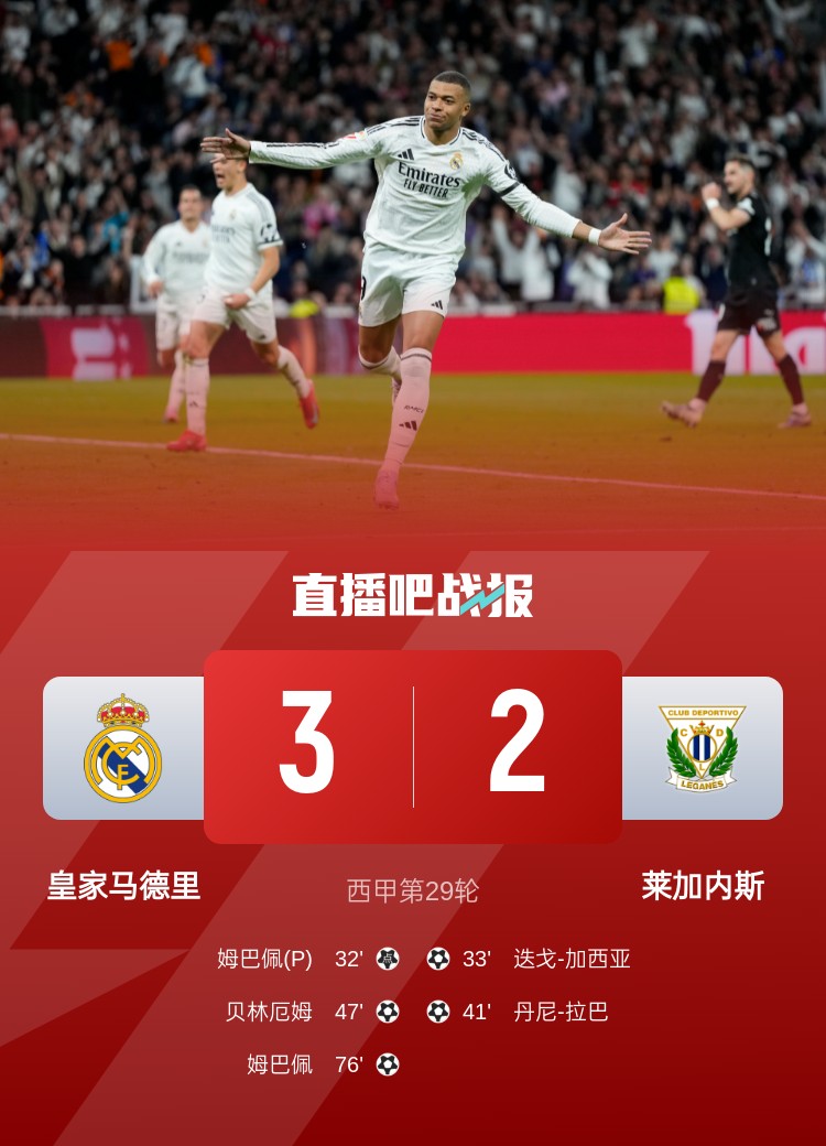 西甲第29轮,皇马3-2莱加内斯,联赛三连胜。上半场,居勒尔造点,姆巴佩点射,迭戈-加西亚迅速扳平,丹尼-拉巴破门反超;下半场,贝林厄姆建功,姆巴佩再下一城。