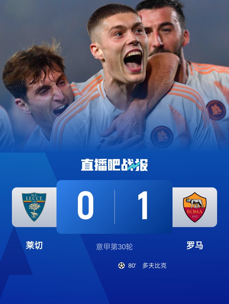 意甲第30轮,莱切0-1罗马。上半场,科内错失良机;下半场,小曼奇尼进球被吹,多夫比克低射制胜。