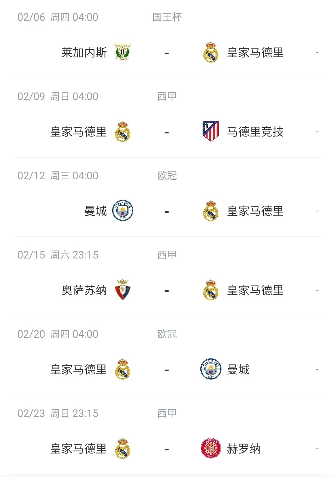2月6日,皇马将在国王杯1/4决赛对阵莱加内斯