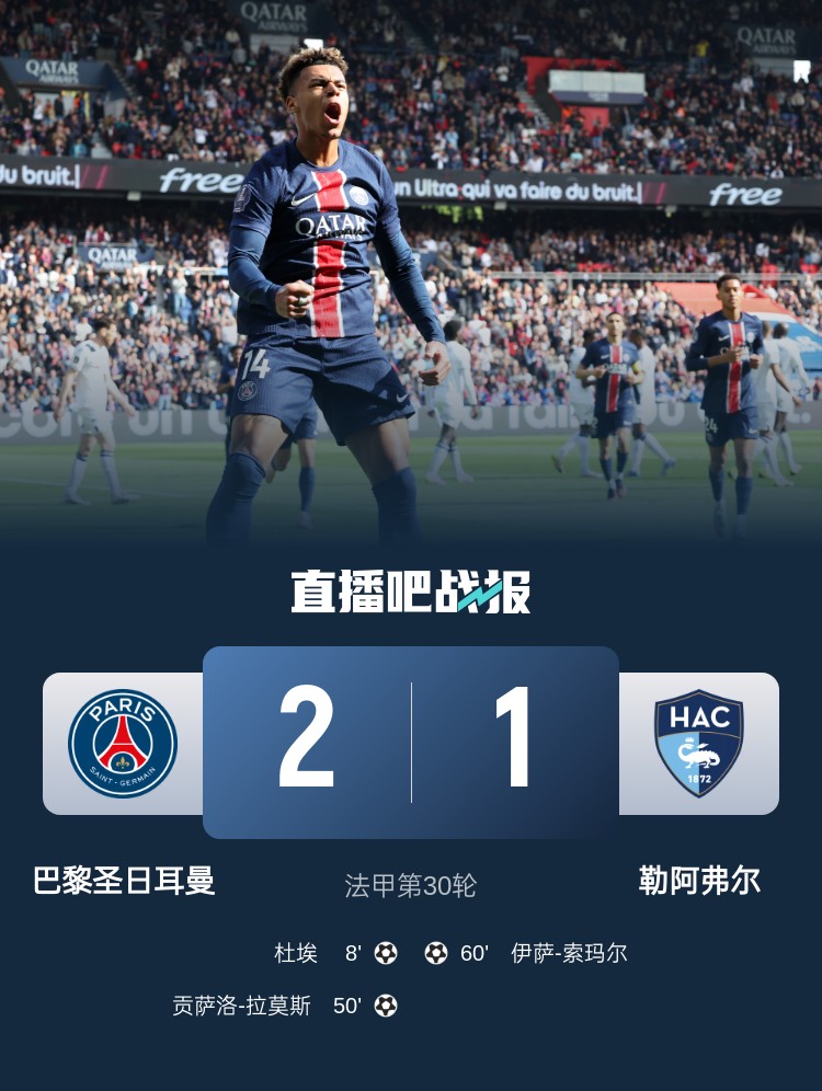 法甲第30轮,巴黎圣日耳曼2-1勒阿弗尔,杜埃、拉莫斯进球。