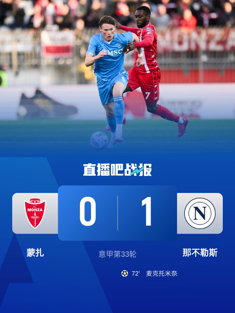 意甲第33轮,那不勒斯客场1-0蒙扎,麦克托米奈制胜。