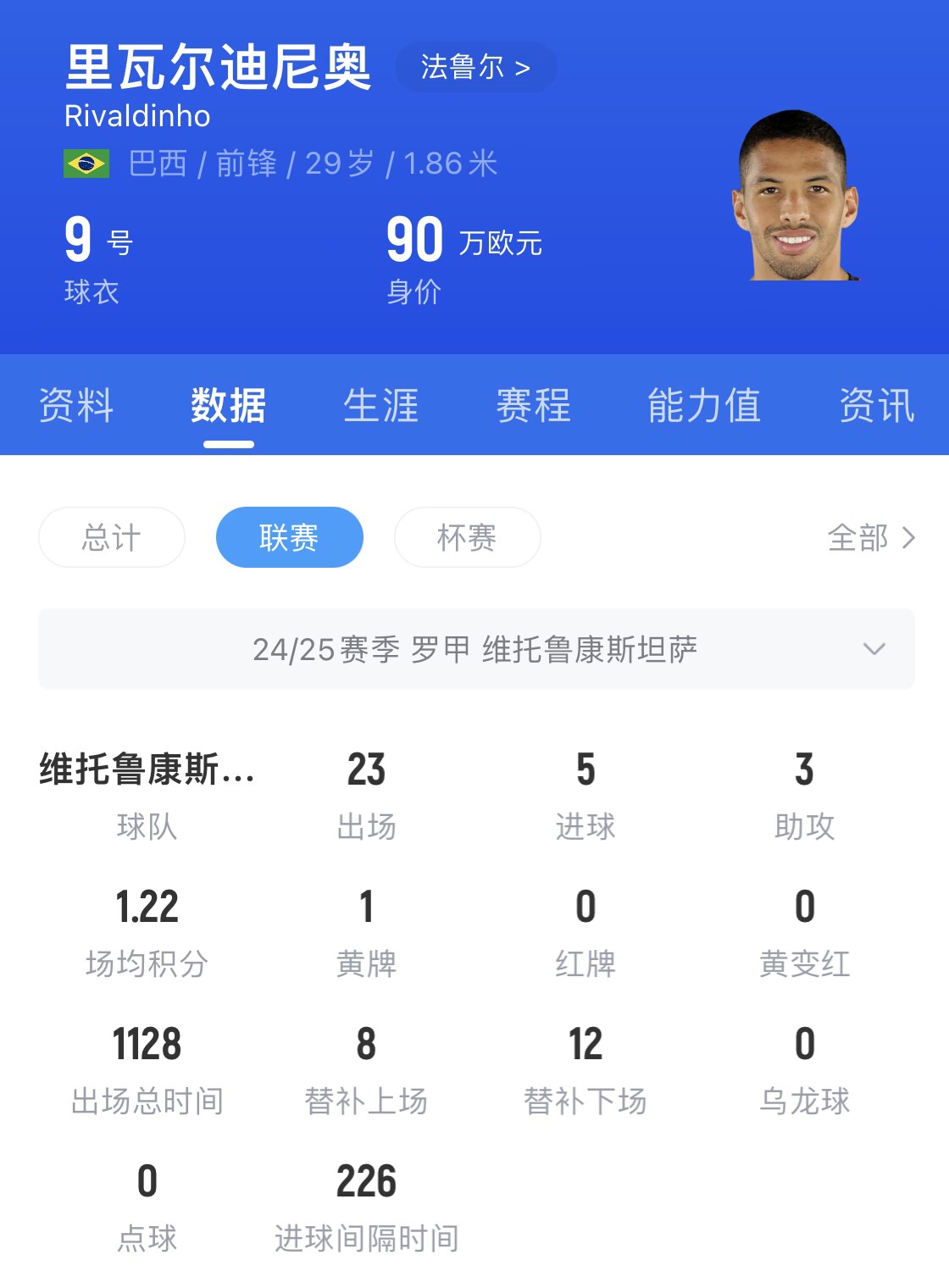 里瓦尔迪尼奥司职中锋,也能客串边锋、中场,身高1米87,先效力于罗马尼亚甲级联赛球队法鲁尔,身价90万欧。