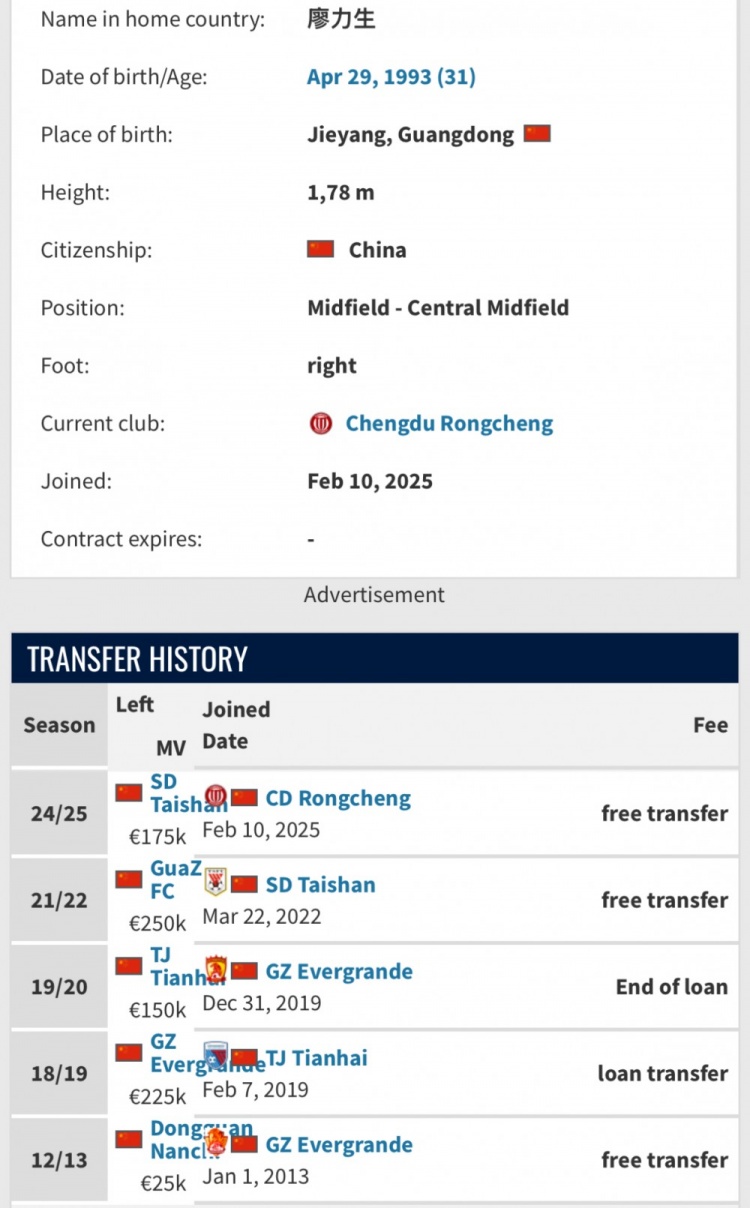 在德转廖力生的个人页面中,他已经于2月10日加盟成都蓉城,但合同年限并未披露。本次廖力生属于自由身转会,因此成都蓉城无需支付转会费用。