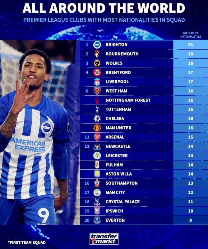 早在征战英冠时期,布莱顿便破费重金请来数学家、逻辑学家和计算机高手打造了球探平台,通过与专业足球网站的合作建立了完善的球员数据库。布莱顿的“魔球”体系覆盖范围极大,会将FIFA排名前100位国家的俱乐部和梯队球员全部纳入考察范围,逐渐形成了依靠“多国部队”打天下的风格。
